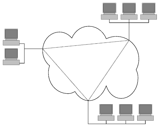 Ein weiteres Problem bei dieser Art der Vernetzung ist oben schon erwähnt: Jeder der Rechner an den gezeigten Standorten benötigt eine eigene IP-Adresse. Diese aber sind knapp. Für jeden hier gezeigten Standort drei IP-Adressen zu bekommen ist zwar kein Problem, viele solcher Adressen zu bekommen ist jedoch kaum realisierbar.