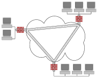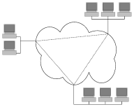 Das erste Bild zeigt, wie klassisch mehrere Standorte über das Internet (dargestellt durch die Wolke) vernetzt wurden. Jeder Rechner der beteiligten Standorte ist direkt an das Internet angeschlossen und kann dadurch prinzipiell mit jedem anderen Rechner im Internet kommunizieren.