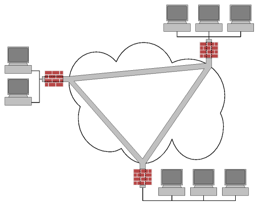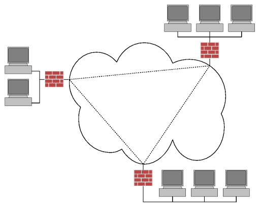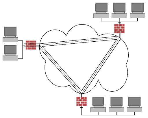 Das dritte Bild zeigt schematisch, wie diese "Rohre" durch das Internet und durch die Firewalls "verlegt" wurden, um die Standorte miteinander zu verbinden.